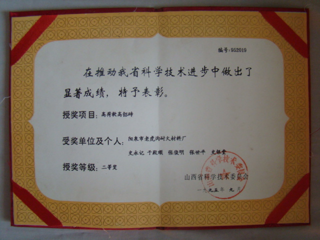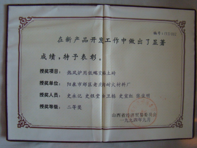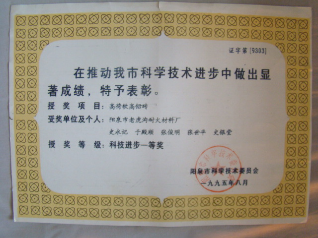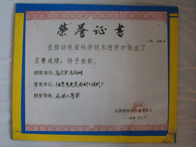 熱風(fēng)爐用低蠕變高鋁磚、高荷軟高鋁磚獲省科技進(jìn)步二等獎,微膨脹高鋁磚列入火炬計(jì)劃項(xiàng)目,炭素焙燒爐用特種高鋁磚已批準(zhǔn)國家專利